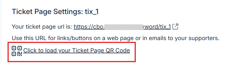 Click the button at the top of the page (just under the blue bar) to load your Ticket Page QR Code.