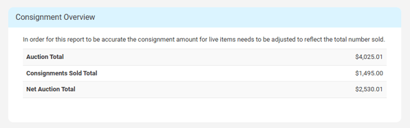 If you’ve included consignment items in your auction, the Consignment Report makes it easy to see how much was earned and what’s owed. This report helps you track your profit and any payouts due to vendors.