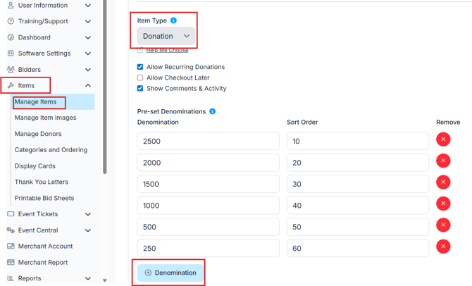 You can create multiple levels of giving in one Donation Item using the Denomination option.