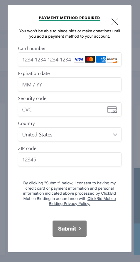 5. If a bidder does not have a card on file, they will be prompted to add one before completing their purchase. Once the card is added, they’ll simply need to reselect the item and finalize the purchase.