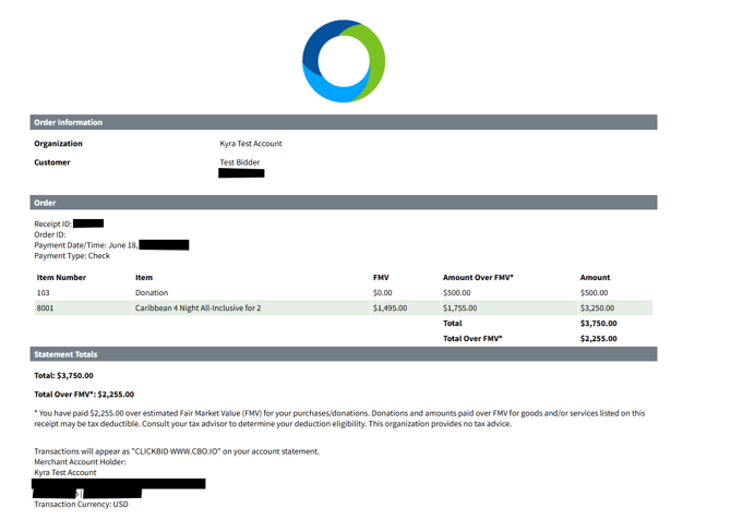 Your bidders' receipts are an important part of their event experience — and you can customize them to reflect your branding and provide essential details like fair market value (FMV), tax ID, and contact info. Here’s how to tailor different parts of the receipt to fit your organization’s needs.