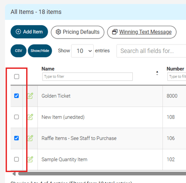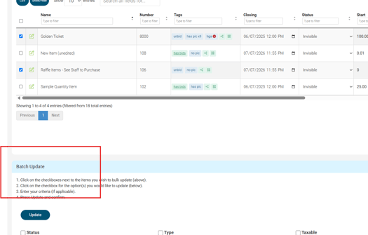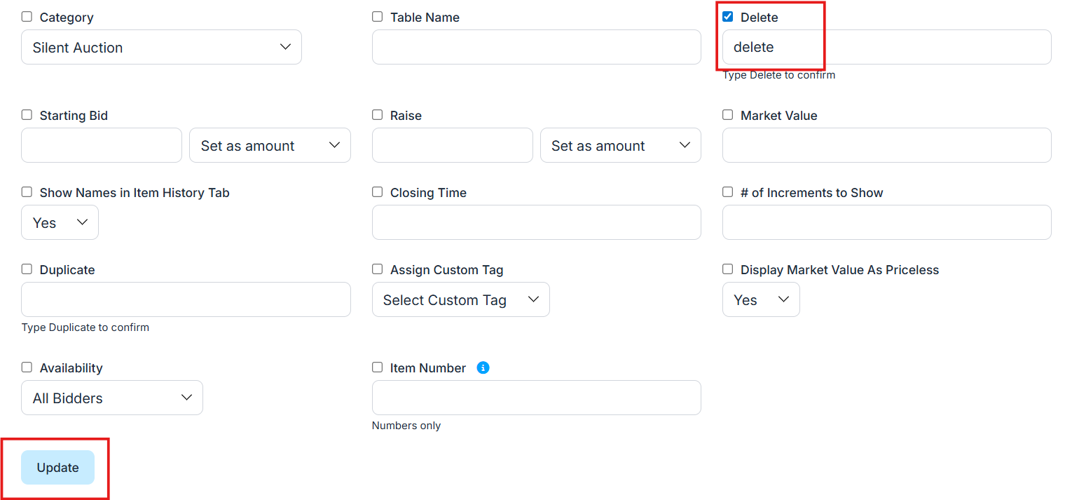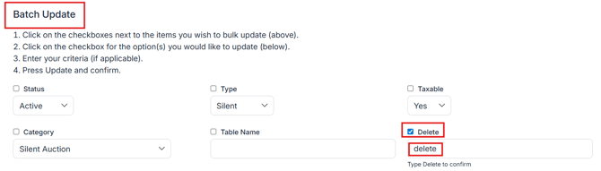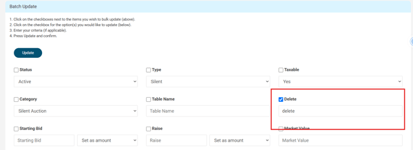 Need to clean up your item list? You can delete auction items in bulk using ClickBid’s Batch Update tool. This helps you quickly remove old or test items before your event goes live.