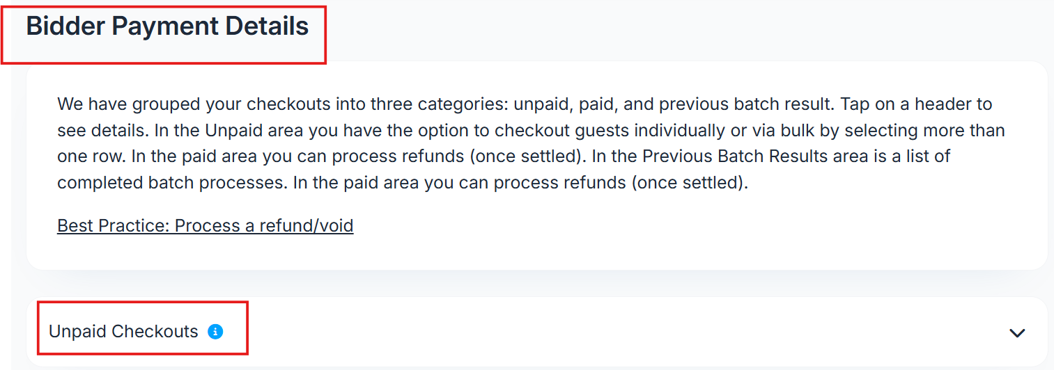 Need to see who hasn’t completed payment after your event? The Unpaid Checkouts section in ClickBid helps you quickly identify outstanding balances and gives you tools to process them all at once.