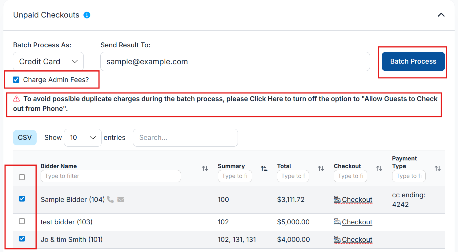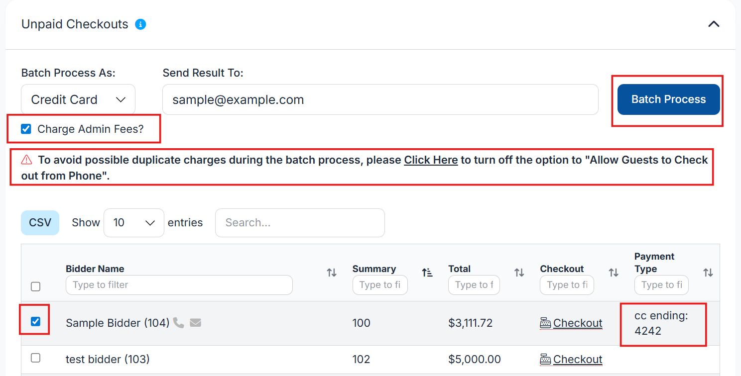 By default, the system will pass credit card processing fees to the bidders during batch processing. If your organization is covering these fees instead, be sure to uncheck the fee checkbox first.