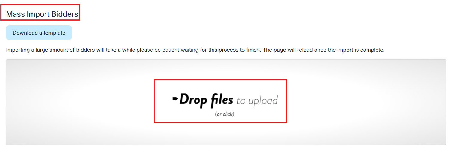 Scroll to the bottom past the Batch Update section and Custom Questions area. Locate the Mass Import Bidders section and click Download!