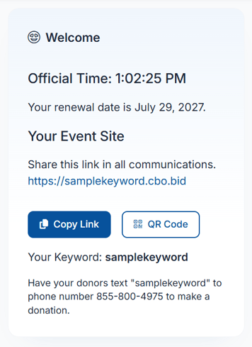 The Welcome Page is your command center in ClickBid. It helps you monitor event status, track fundraising totals, confirm bidder activity, and quickly access sharing tools, all without digging through multiple menus.