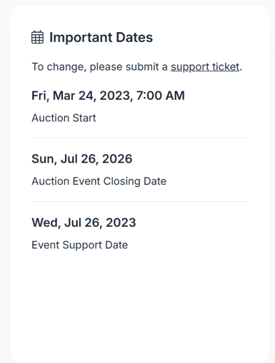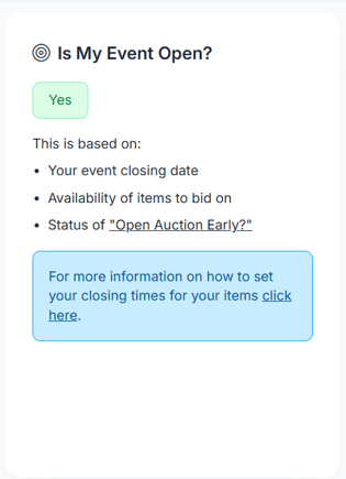 If your event isn’t open when expected, double-check your item closing times and auction settings.