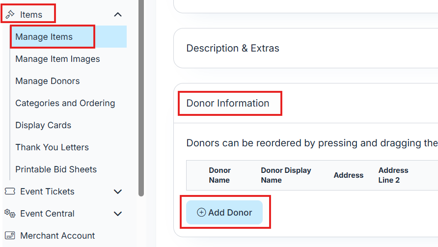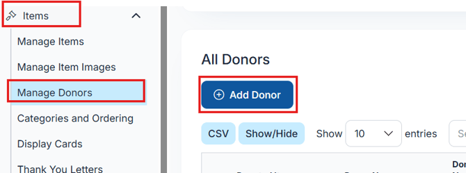 Go to Items > Manage Donors