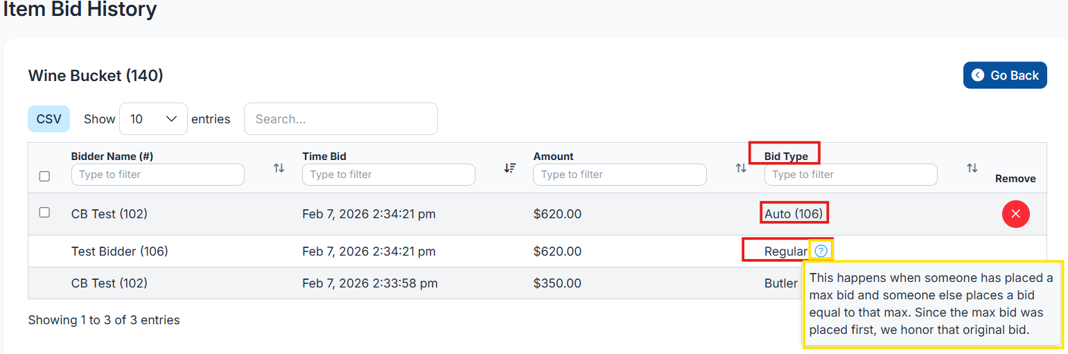Auto = The system placed the bid for a bidder using Max Bidding