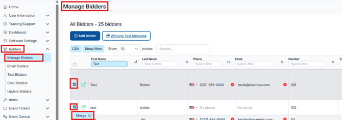 Check the boxes next to the two bidder records you want to merge.