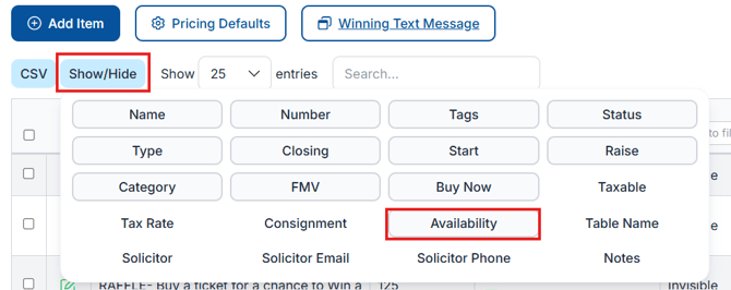 ℹ️ Info: By default, the Availability column is hidden. Turning it on is a great way to double-check visibility across your auction items.