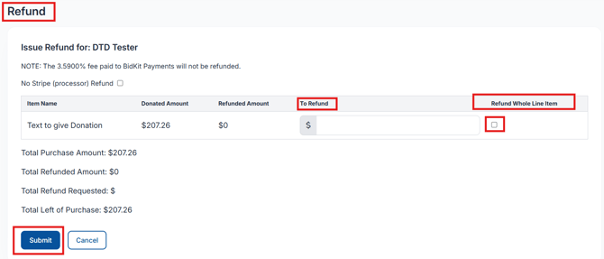 Add the amount to be refunded. If refunding the full amount click the Refund Whole Line Item box.