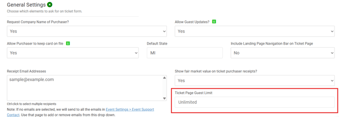 Ticket Page Guest Limit will default to Unlimited (the box is empty). You can also enter "0" for unlimited.