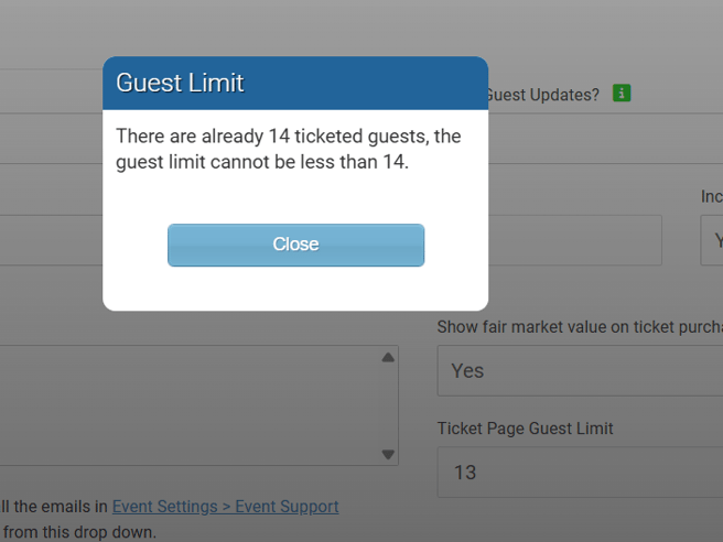 Example: If you’ve already sold 14 tickets, and try to reduce your event’s guest limit to 13, you'll see a popup warning that you cannot set the limit below the current number of guests. ⬇️
