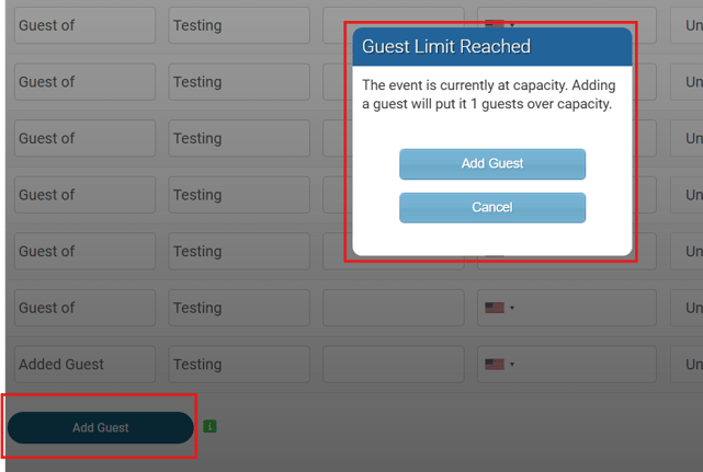 If your event has a guest limit and you're working with RSVP tickets, you’ll see a warning message when adding a guest that would put you over the limit.