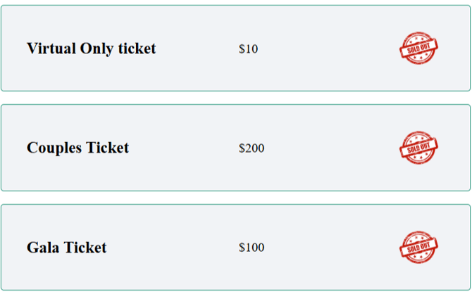 When the maximum guest capacity has been reached, the ticket page will display 'Sold Out' for all tickets and sponsorships during the purchasing process (shown below ⬇️)