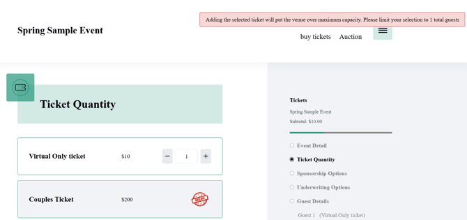 If the ticket type is still available, but the quantity selected would exceed your event’s capacity, a message will appear to inform the buyer.