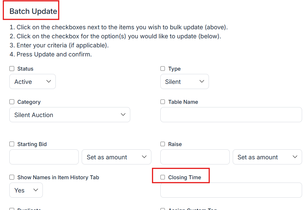 The Item Closing Time is the exact moment when bidding ends for each item. After this time, bidders can no longer place bids on those items. This is especially helpful for managing auction flow and controlling when silent items officially close.