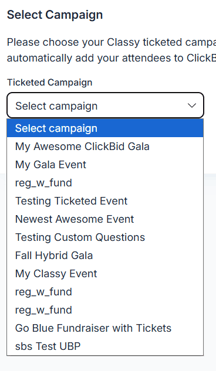 In ClickBid, select the Classy Campaign you want to connect.