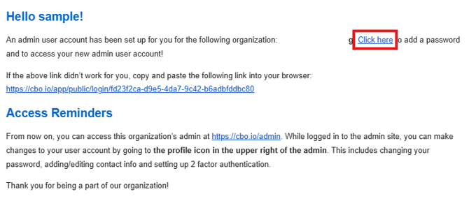 Once a password has been created, the user can login to their account at cbo.io/admin.