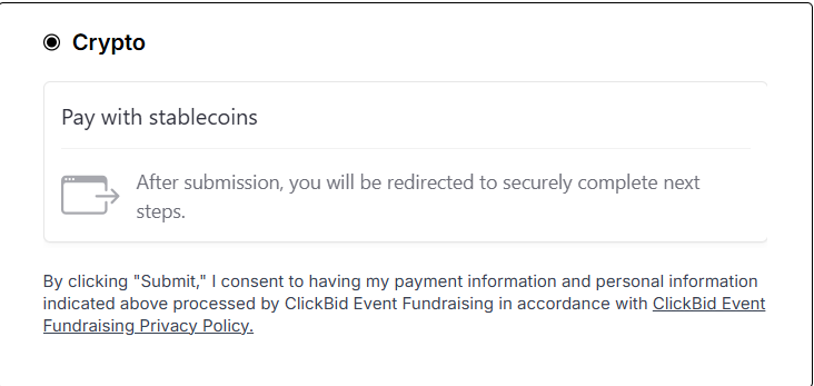 Crypto payments give donors another flexible way to support your event, while still processing securely through Stripe. ClickBid allows you to turn Crypto on or off at any time, track approval status, and decide whether it’s right for your organization. While Crypto has a few limitations, it can be a valuable option once Stripe approval is complete.