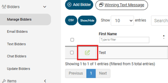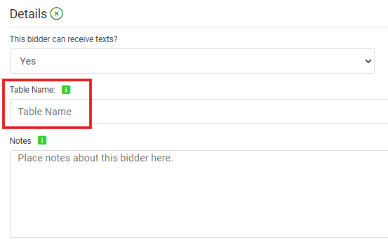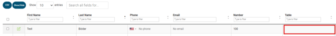 Click the green pencil icon next to a bidder’s name, and type in their Table Name/Number.