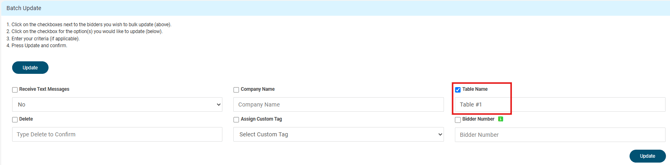 The fastest way to update table numbers for multiple bidders is to use the Update Bidders upload tool.