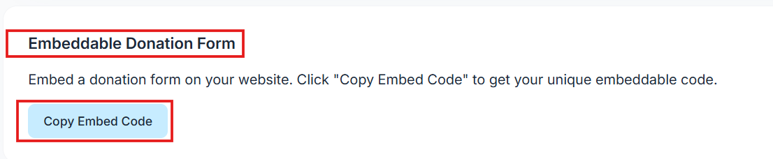 Locate Embeddable Donation Form then click the Copy Embed Code button.