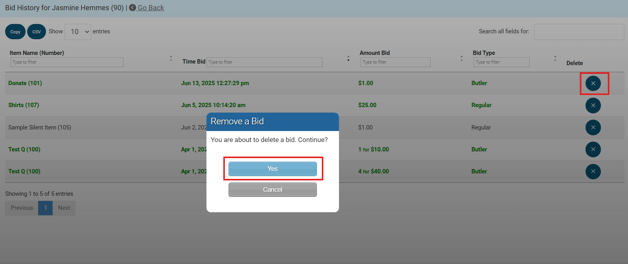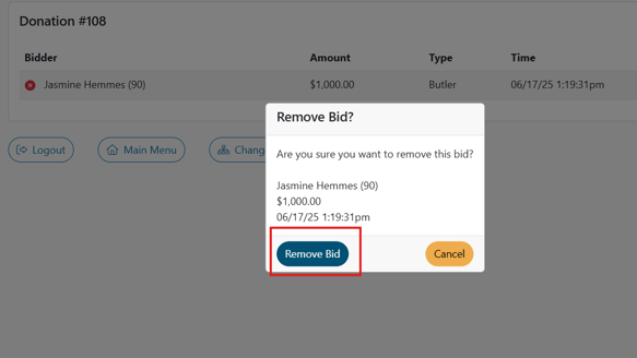 Need to remove a bid during your event? Whether it’s a mistaken bid or a bidder who changed their mind, ClickBid gives you a few easy ways to manage and remove bids — right from the Butler, the Bidders page, or the Items page.