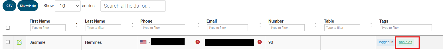ℹ️Info: This method is helpful when the focus is on a specific person rather than the item and can also be achieved in the butler when searching for the bidders name in Bidder Lookup.