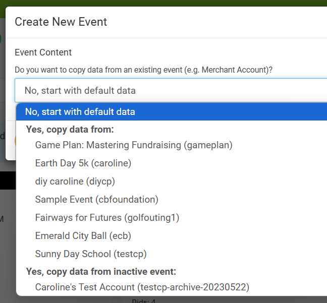 The Events tab in ClickBid gives you access to all of your organization's events—both active and inactive—along with powerful tools to view, organize, and create more.