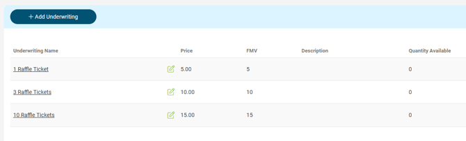 Go to Event Tickets > Ticket Page > Modify Tickets > Add Underwriting