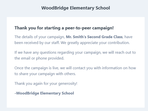 After submitting the form, supporters receive an email confirming their campaign was submitted for review.