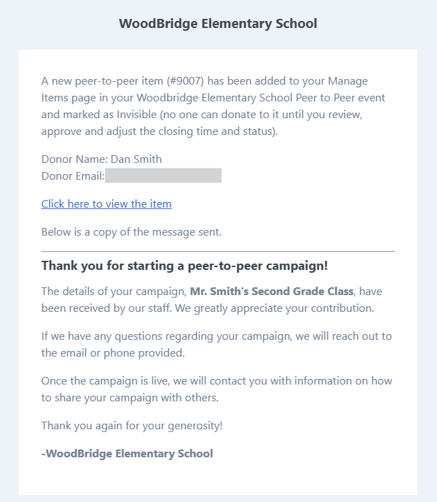 Your organization will receive an email notification for the peer-to-peer item, including the message that was sent to the campaign manager.