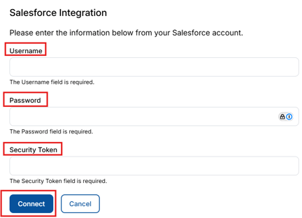 In the pop-up window, enter your Salesforce Username, Password, and Security Token.