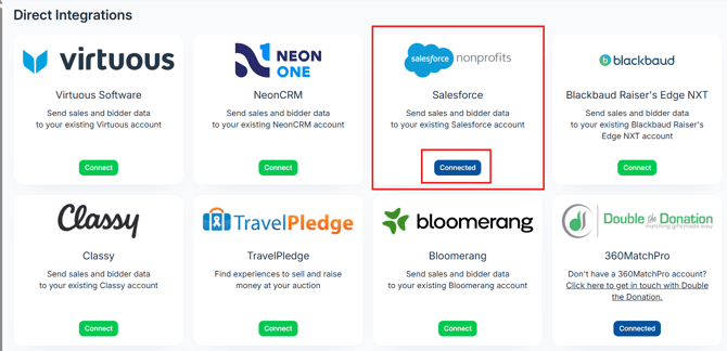 ClickBid’s Salesforce integration lets you seamlessly sync bidder and sales data with your Salesforce CRM. Whether you're importing contacts or pushing donations and ticket sales back into Salesforce, this integration saves time and keeps your data clean and consistent.