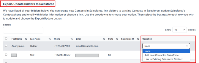 ClickBid allows you to export new bidders or link to existing Salesforce contacts.