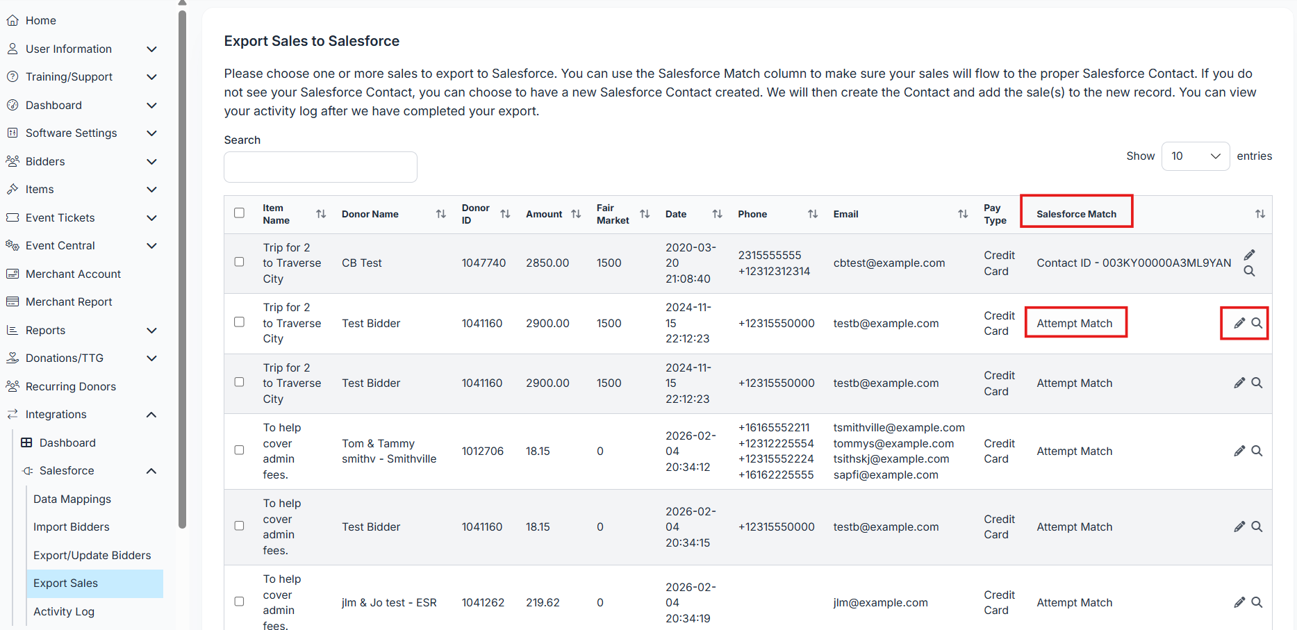 ⚠️We match on last name, email, and phone number. If all three do not match you will see Attempt Match. If you do not select a match from the Magnifying Glass and their are 5 contacts the export will be sent to the first one on the list. Doing this can put sales in the incorrect contact. (example: Jane Bidder, Tim Bidder, Test Bidder all those last names have Bidder so an attempt match will be created)