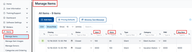 next to the item name and add/update the amounts there. Suggested is to add the starting bids, raise increments, and buy now options while adding the item. You can always update if needed.
