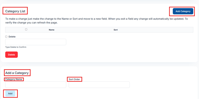 📸 Suggested Screenshot: Highlight the "Add Category" button and the "Sort Order" dropdown.