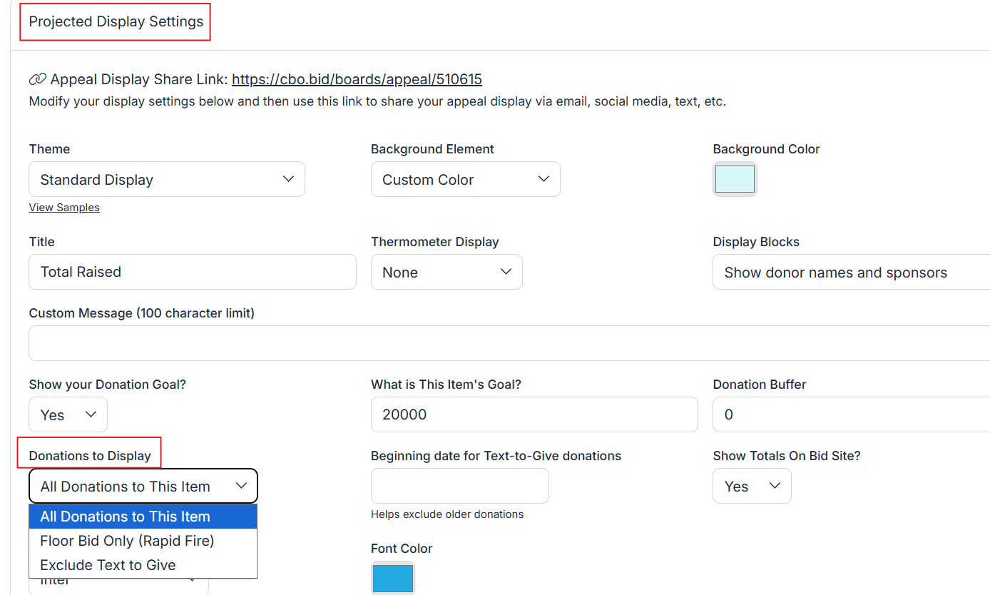The Donations to Display setting lets you control which types of donations appear in live displays, such as a paddle raise thermometer or projector screen totals.