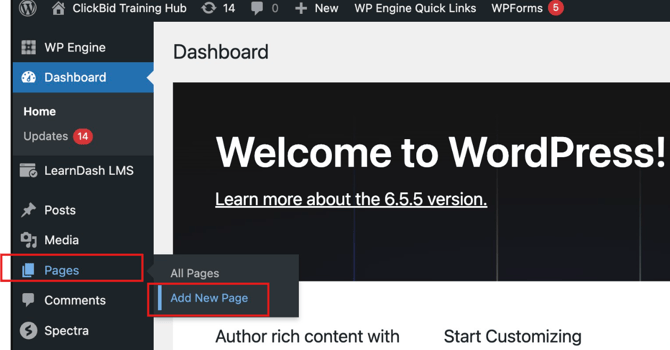 Hover over Pages in the left-hand menu and click Add New Page.